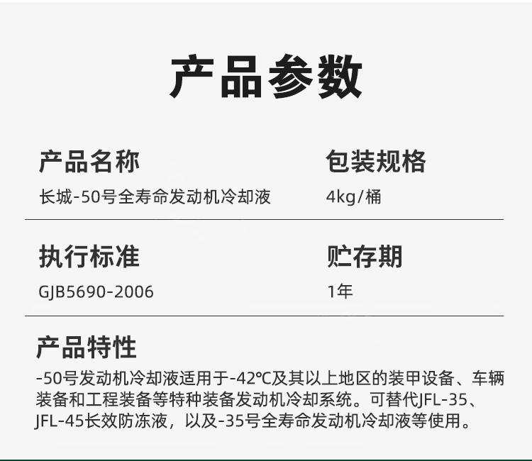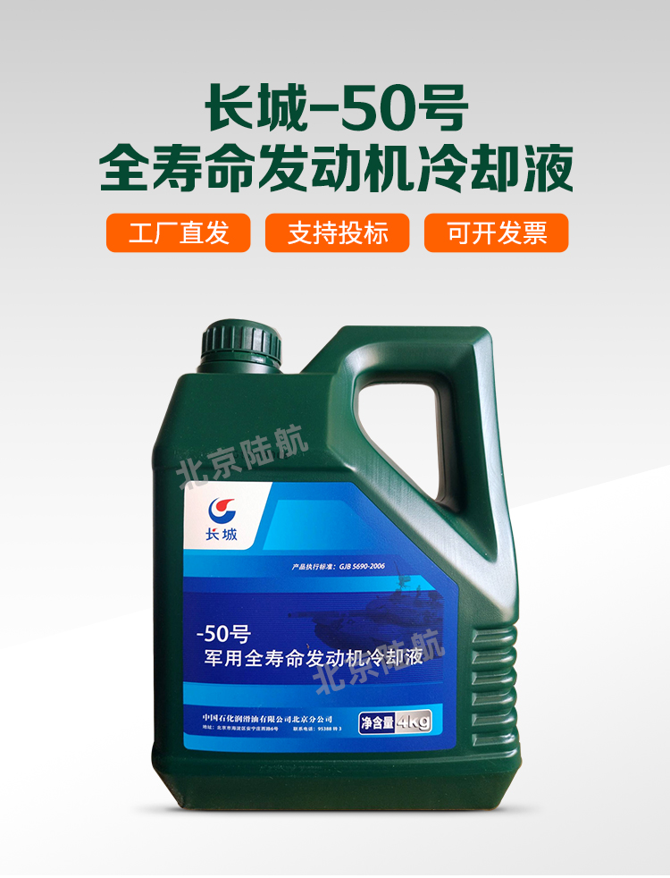 长城-50号全寿命发动机冷却液是为装甲装备、车辆装备和工程装备研发的特种冷却液。可替代JFL-35、JFL-45长效防冻液以及-35号发动机全寿命请留意。该产品可在-42℃的极寒条件下使用。