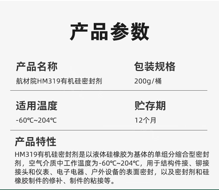 HM319密封剂为单组份包装,对多种金属、硅酸盐玻璃、聚碳酸酯等材料具有良好的粘接性。工作温度为-60-250°C。