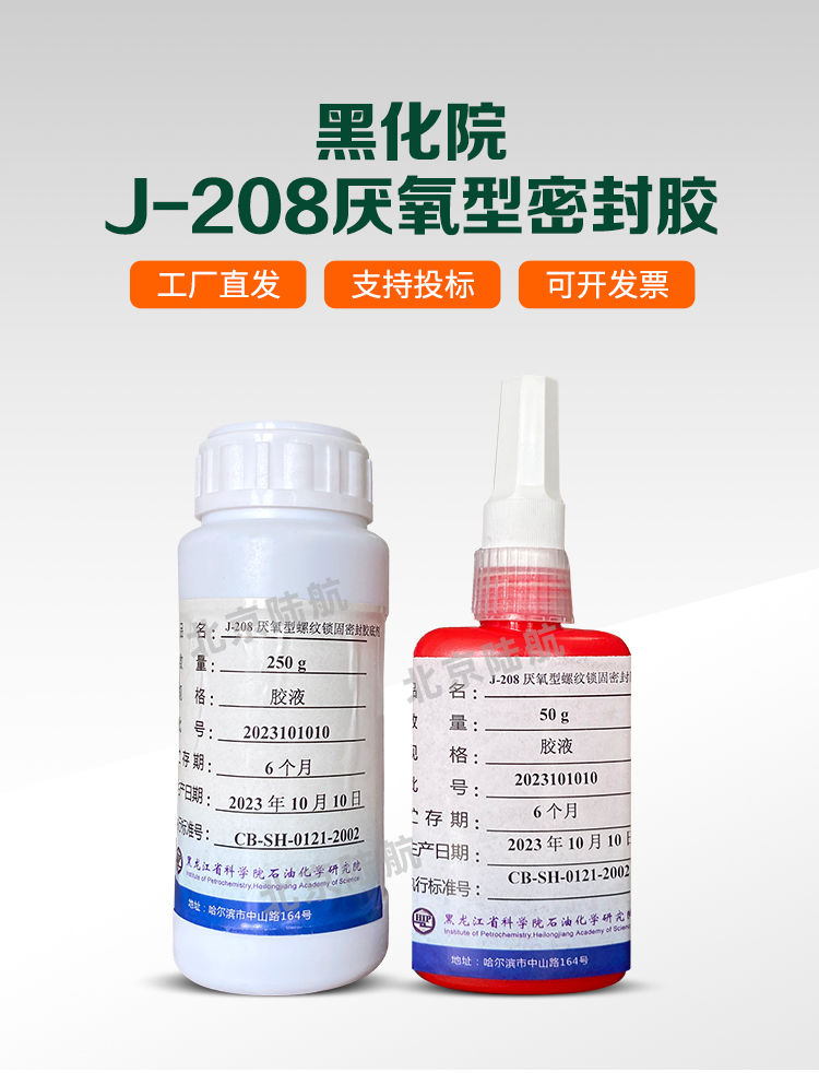 J-208 厌氧型螺纹锁固密封胶具有固化速度适宜,耐溶剂,耐高低温,对粘接物无腐蚀性,操作简单,综合性能良好等特点。适用于易腐蚀金属螺纹件的锁固和密封。使用温度范围为-55~150℃。